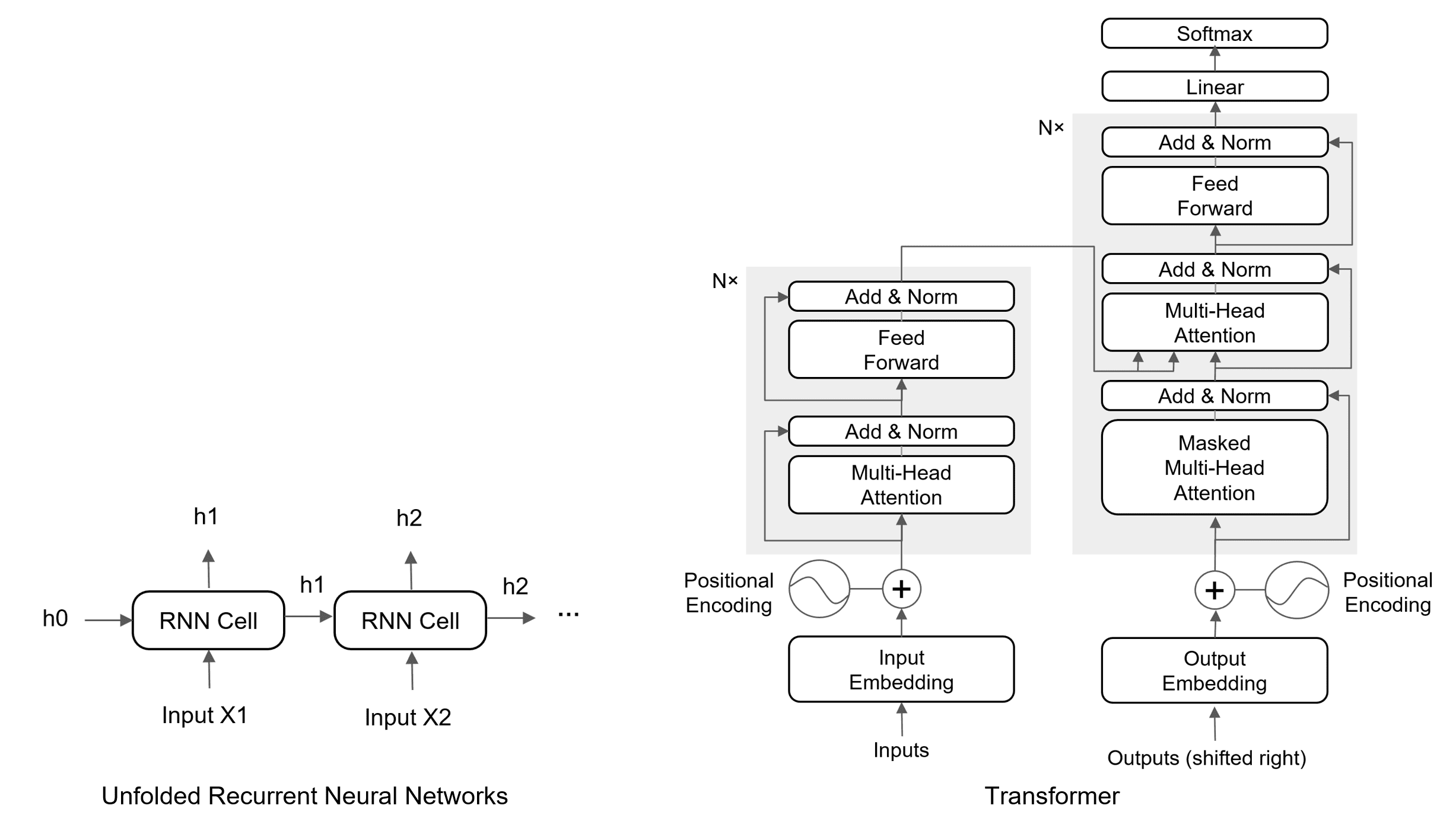 The figure below demonstrates the architectures of RNNs and Transformers.