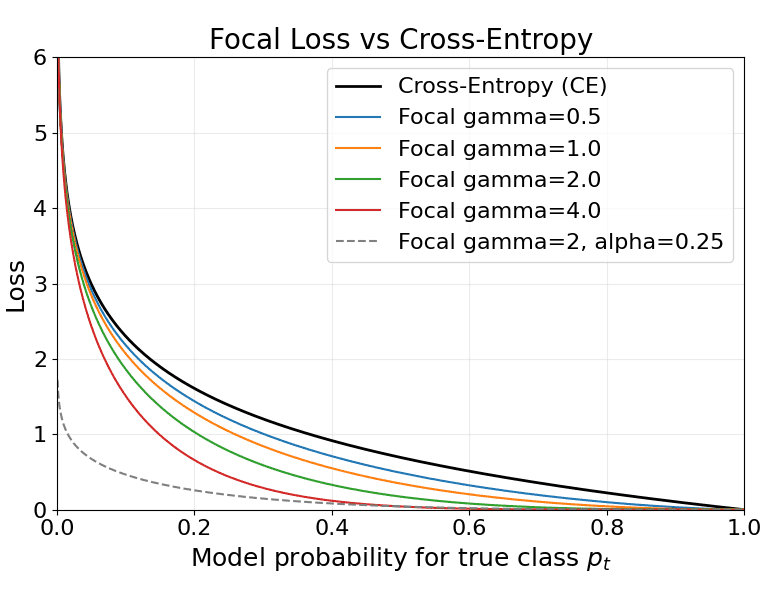 The plot below shows cross-entropy and focal-loss curves for several \gamma values and an example \alpha.