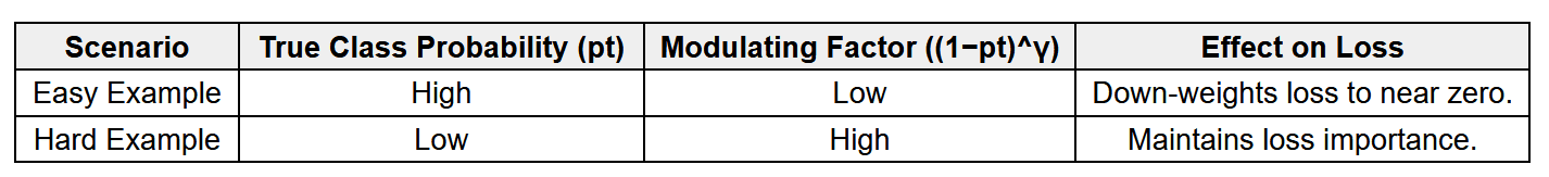 (2) Modulation: The factor (1 - p_t)^\gamma reduces loss from well-classified (high-confidence) examples, concentrating gradients on hard / low-confidence examples.