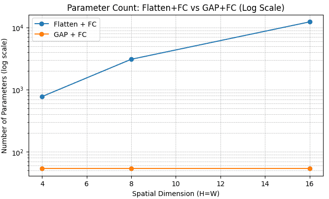 The image below shows examples of parameter comparisons between using Flatten + FC and GAP + FC. There is a total of 6 classes and 8 channels.