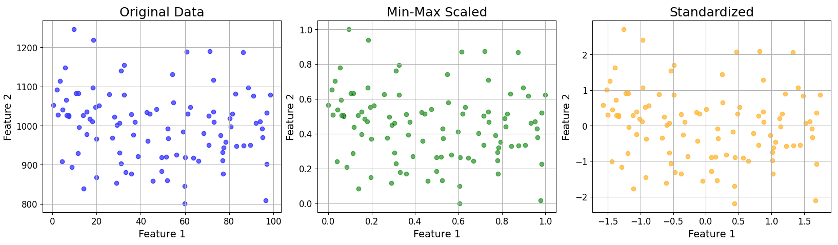 Below shows an example plot for original, min-max scaled, and standardized data.